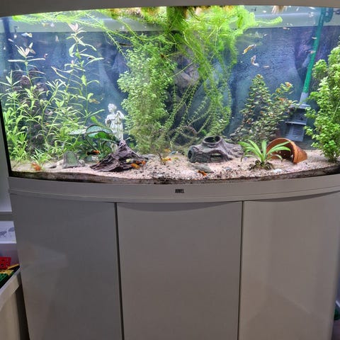 Hyvässä kunnossa ja tasapainossa oleva akvaario. Myydään vain kokonaisuutena, kaloista ei myydä mitään muita erikseen kuin juovavaanijakala naaras joka kaipaisi kumppania.