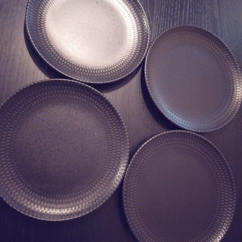 Sekalainen setti lautasia ja kulhoja. Käytönjälkiä on, mutta ovat silti ehjiä.