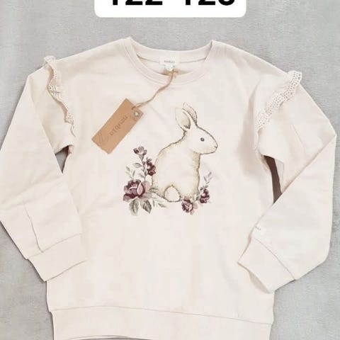 Kuvan Cubus joustinneulepusero röyhelöllä. Röyhelö kiertää ympäri, eli myös takana. Hieman pesunukkaa, jota ei niinkään erota. Koko 122/128.
