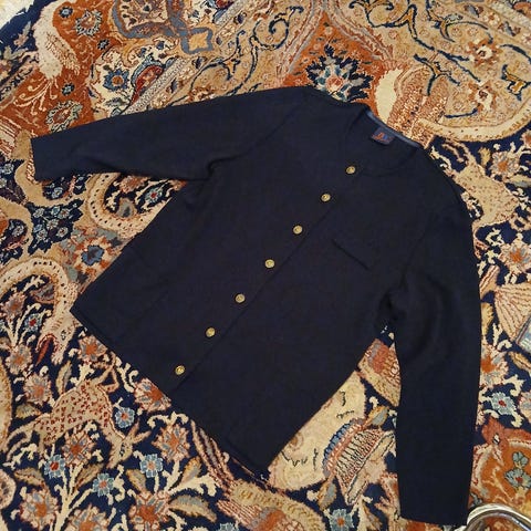 Tämä vaatii korjausta, sillä takissa on useita pieniä reikiä edessä. Lisäksi yksi nappi on irronnut, mutta se on tallessa taskussa. Kts kaikki kuvat.