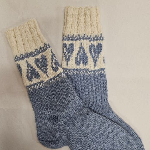 Lempeän siniset käsinneulotut villasukat, joissa kaunis kuvioneule. Lämpimät, kestävät ja tyylikkäät – täydelliset kylmiin iltoihin tai lahjaksi.