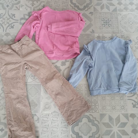 Kuvan H&M:n röyhelöpusero kokoa iso 122 sekä Ciraf merkkiset leggarit kokoa 128. Siistit.