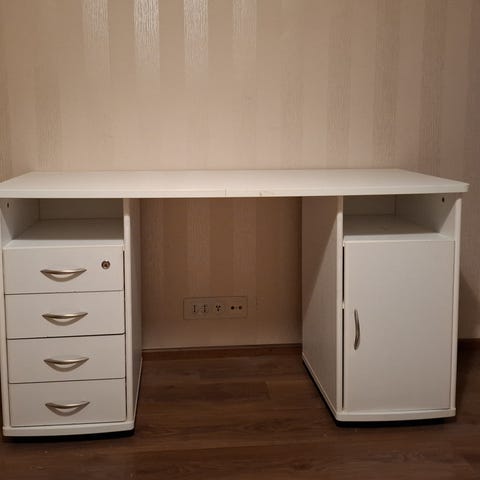 Työpöytä, jonka mitat ovat 130x60 cm, neljä laatikkoa ja yksi säilytystila oikealla puolella. Käytetty lemmikkieläimettömässä ja savuttomassa ympäristössä. Tuo oma kulkuväline mukanasi.