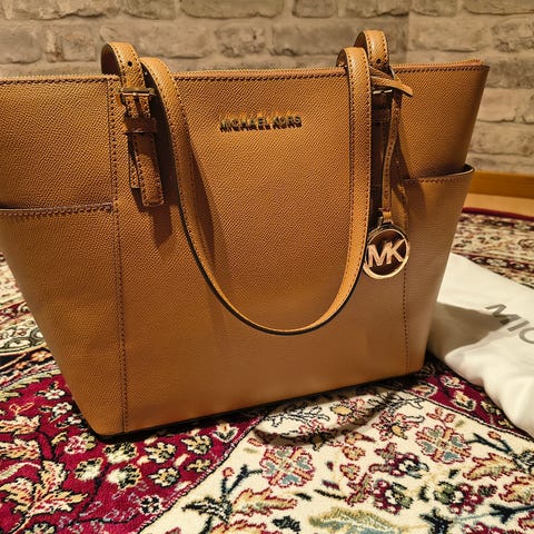 Erittäin tyylikäs Michael Korsin käsilaukku, mallia Carmen. Laukkua voi kantaa kahvoista tai lyhyestä olkahihnasta.