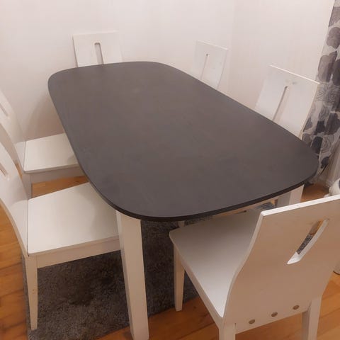 Korkeakiiltoinen ruokapöytä sekä tuolit (6 kpl)