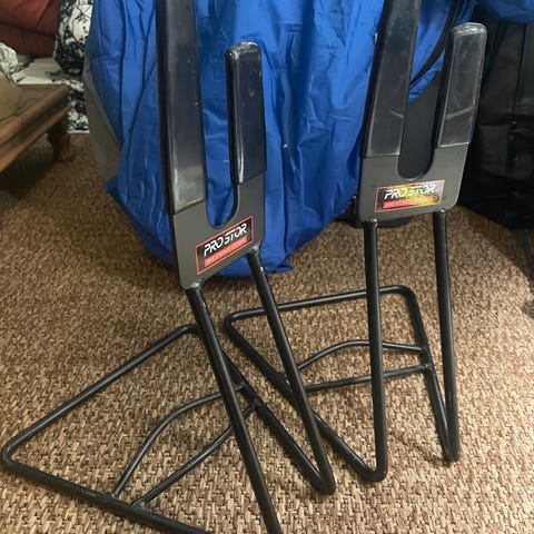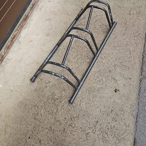 Sinkitty metallinen polkupyöräteline, jossa on neljä pyörän paikkaa. Sopii ulko/varastokäyttöön. Toisessa reunassa sinkityksestä huolimatta ruostetta.
