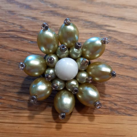 Kukkarintakoru helmellä ja filigraanikuviolla, koko 6,5 x 2,5 cm.