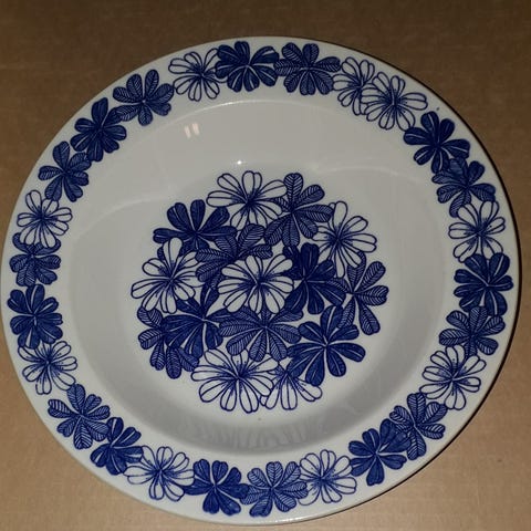 54 kpl Arabia Sinivalko sarjan lautasia ja kulho. Osassa piippuleima, osassa kruunuleima. Myös raidan paikka vaihtelee osassa lähepänä reunaa ja osassa hieman kauempana reunasta. Valmistettu 30-50 luvulla, suunnittelija Kurt Ekholm. Kaikki käytettyjä, joissain vain hyvin vähän käytön jälkeä, joissain reilummin. Saa tulla katsomaan. Vain nouto tai voin tuoda lähialueelle.