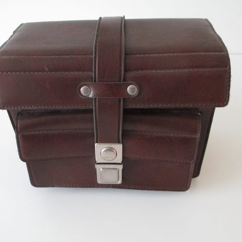 Erilaisia vanhoja kamera/objektiivilaukkuja.