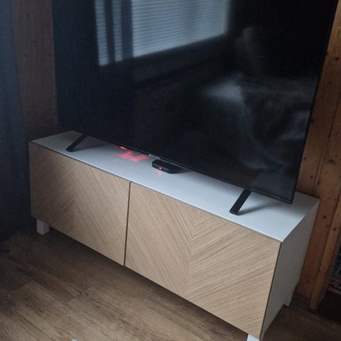 Ikea Bestå TV-taso kohtalaisessa kunnossa, takavaneri haljennut molemmista reunoista kts. Kuva takaosasta(sinänsä turhat vanerit), muutoin hyvässä kunnossa. Vain haku.