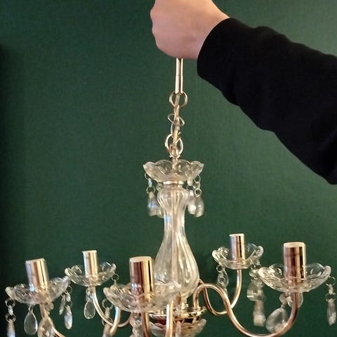 Kaunis ja hyväkuntoinen valaisin, aidot kristallit. Koko noin 50x35cm. Kaikin puolin toimiva, uudet polttimat vain tarvitsee. Vain nouto, en postita.