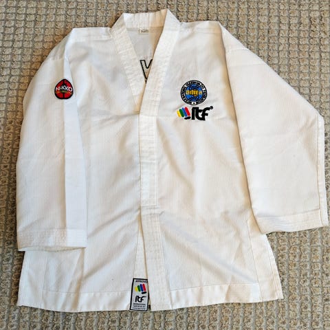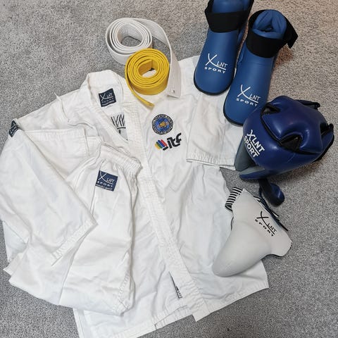 120 cm kokoinen taekwondopuku kahdella vyöllä, kypärä (M, säädettävä), jalkasuojat (XS) ja hanskat (S/M). Vähän käytetyt ja hyväkuntoiset. Nouto Piippolasta tai Sievistä.