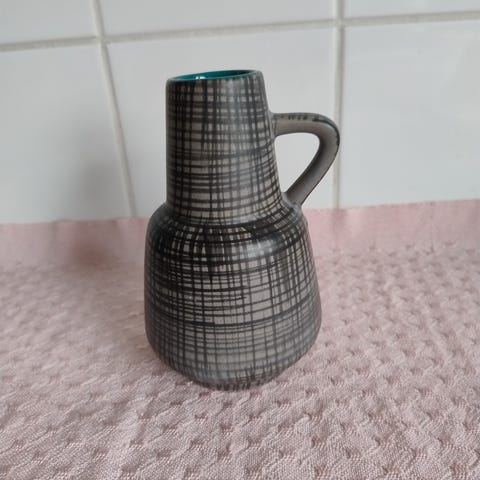 Täysin ehjä ja siistikuntoinen, Laholms keramik 2632 leimat pohjassa. Korkeus 24,5 cm, halkaisija 8 cm.