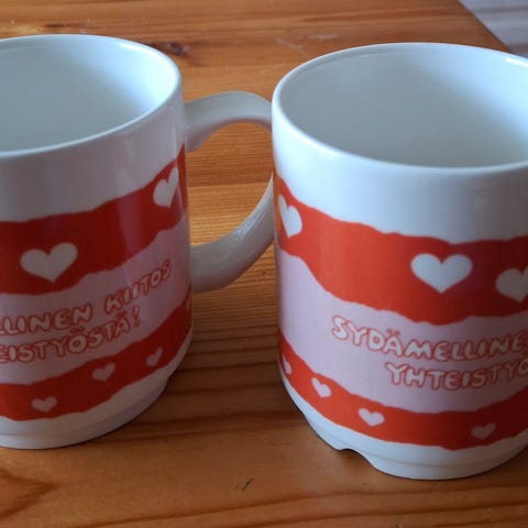 Heikki Orvolan suunnittelemat Moreeni kahvikupit 22 kpl ja niihin sopivat Balladi aluslautaset 34 kpl