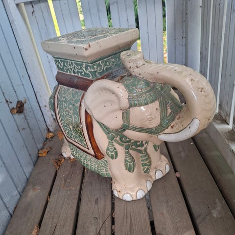 Keraaminen norsu kukkateline, pituus 18 cm, leveys 10 cm, korkeus 19 cm. Täysin ehjä.