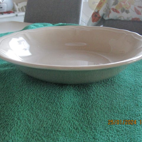 Saksalainen tarjoilulautanen. Kultauksessa hieman kulumaa, muuten ehjä ja hyväkuntoinen. Halkaisija 26cm