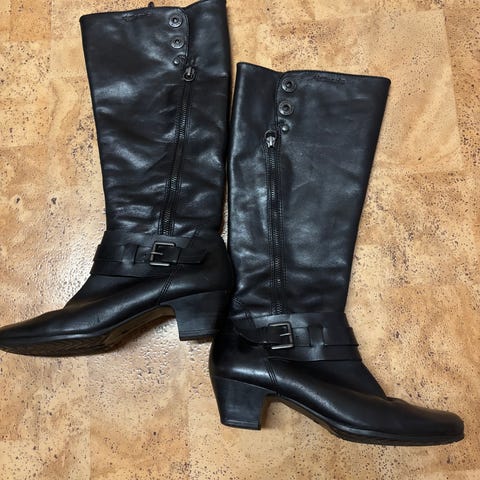 Tamaris saappaat, koko 38. Mustat nahkaiset saappaat, joissa kiilakorko ja nyöritys edessä. Saappaissa on lämmin vuori nilkkaa ympäröivällä neuleosalla. Sopivat käytettäväksi kylmempinä vuodenaikoina.