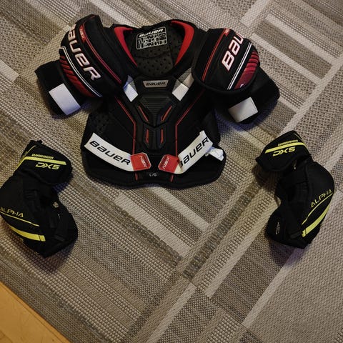 Bauer JR jääkiekko suojavarusteet sisältäen säärisuojat, housut ja hartiasuojan. Koko Small, suunniteltu juniorikäyttöön.