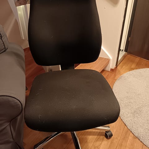 Tuoli, jossa musta istuin ja valkoinen metallinen kehys. Istuin on pehmustettu kankaalla, ja selkänoja on valmistettu vaaleasta puusta. Muuten täysin priimakuntoinen, mutta saattaa olla koirankarvoja.