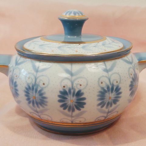 Arabia sokerikko piippuleimalla, siisti ja ehjä+ kermakko jossa halkeama+ kuvan kupit