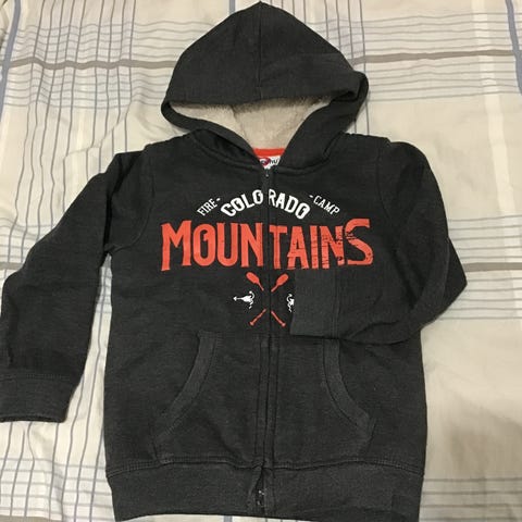 Harmaa paksu huppari kooltaan 122 cm. Edessä vetoketjuttomat taskut. Hyväkuntoinen.