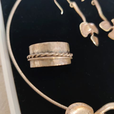 Keskellä olevaa kehää pystyy pyörittämään. Paras käyttää esim etusormessa ja peukalolla pyörittää kehää. Sopii hyvin esimerkiksi ADHD ihmiselle. 925 hopeaa ja koko n. 18,7mm