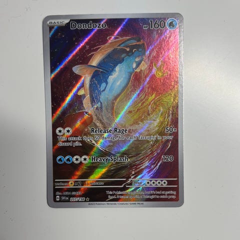 Pokémon Dondoza 207/198 kortti, laitettu suoraan avatusta pakasta muoveihin.