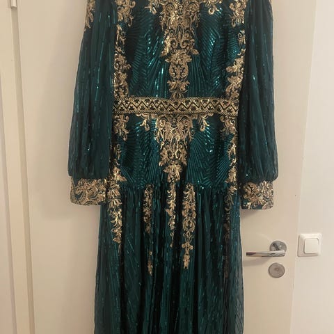 100 % viskoosia oleva hieno uusi mekko. Viininpunainen kullanvärisin koristein. Vyötöröllä ja hihan suissa kuminauha kiristys. 2 kangaskerrosta. Maksanut 115 eur.