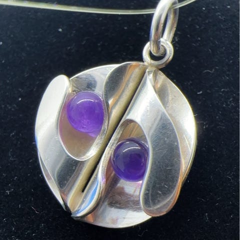 Hopeinen elis kaupin suunnittelema hopea ametisti riipus. Lenkki riipuksesta joskus katkastu jossa ollut leimat että sai kivemmin kaulaan. Hopea ketju. Ametisti pallo riipuksen sisällä. Hieno käsityö. Harvinainen.