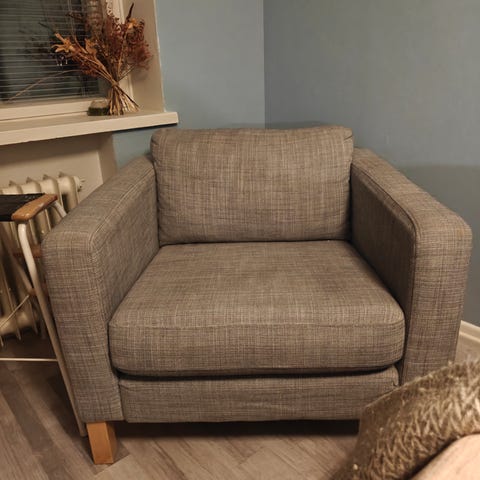 IKEA nojatuoli valkoisella kankaalla. Tuolissa on pehmustettu istuin ja selkänoja, pyöreät käsinojat sekä irrotettava päällinen. Sopii olohuoneeseen tai muuhun oleskelutilaan.