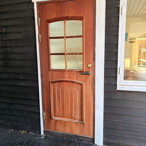 Ulko-ovi / terassin ovi. Koko n. 80 x 210cm. Sisäpuoli valkoinen, ulkopuoli tumman ruskea. Ei karmeja. Sälekaihtimet. Lukko jouduttu poraamaan auki (kuva 3). Korjattavissa jos haluaa pienen reiän piiloon. Nouto Vaajakoskelta.