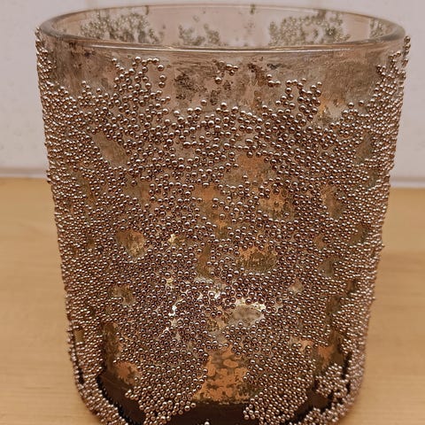 Lasinen lyhty lämpökynttilälle. Halkaisija 8,5 cm, korkeus 10 cm.