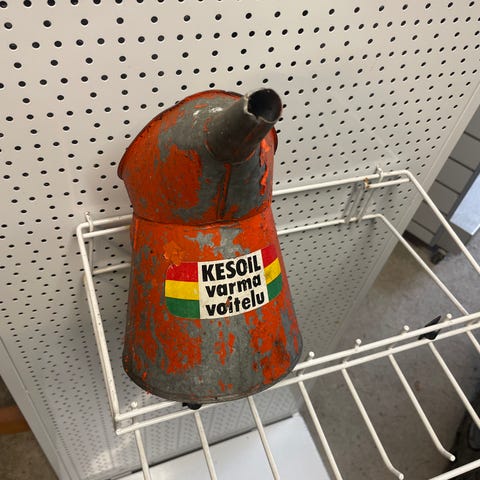 Aitoa suomalaista huoltoasemahistoriaa – kannussa alkuperäinen KesOil “Varma voitelu” -tarra.