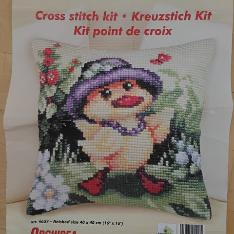 Sisältää kaksi kangaspohjaa, taulukehykset, langat ja neula, sekä ohje.