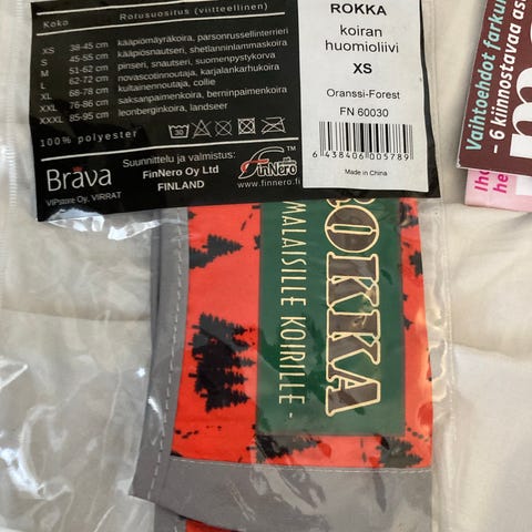 Sopii keskikokoisille koirille. Selkä 28 cm, kaula n. 40 cm, koko pituus n. 38 cm. Kiinnitys säädettävissä napinläpikuminauhalla. Kaikki kolme yhteensä 18€