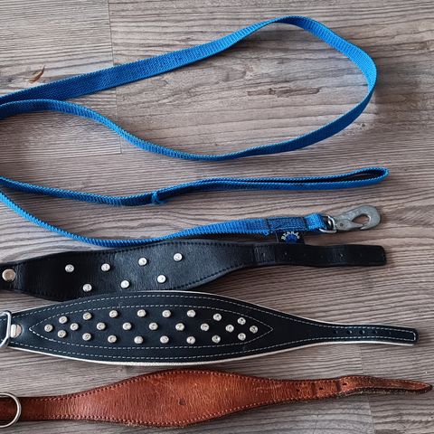 Mikaz nahkaiset vinttikoirapannat (levenevät). Leveys leveimmillään n 5 cm ja pantojen ympärykset noin 29-36. Kaikki yhteensä 30€, voi ostaa myös yksittäin 10€/kpl..