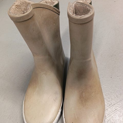 Myydään Tretorn-merkkiset talvikumisaappaat lämpövuorella. Saappaissa normaalia käyttökulumaa. Heijastimet irronneet kantapäistä ja toisen kengät pohjasta tumma merkkilaatta. Sisävuori kulunut kummastikin saappaasta ja toisen paikkasin villasukkien paikkausmenetelmällä.Toisessa kuluma-alue pieni ja esim.villasukan kanssa ei varmasti haittaa kylmillä keleillä. Saappaat on pesty käytön jälkeen ja leikkasin niihin uudet lämpöpohjalliset, joten ne ovat valmiina seuraavalle käyttäjälle. Puutteet huomioitu hinnassa.