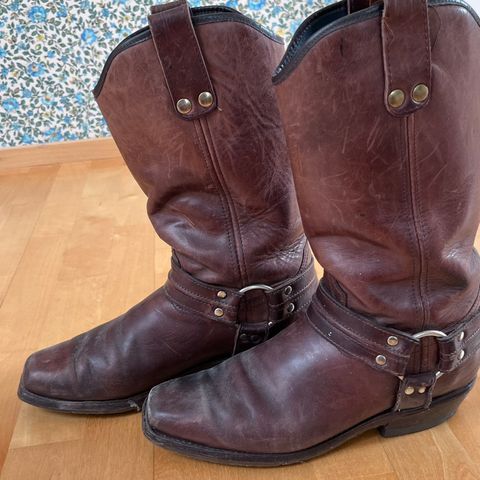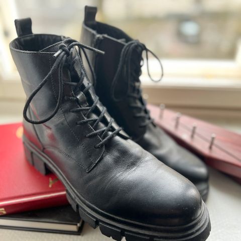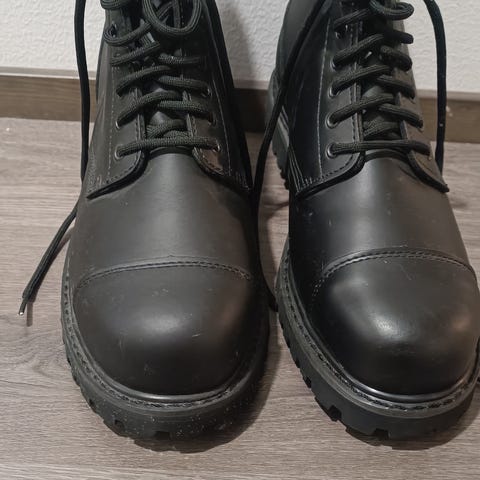 Käyttämättömät bootsit upeilla yksityiskohdilla. Ovat tehtaan kokoa 48 mutta lesti on pieni ja kapea joten eivät mahtuneet jalkaani. Käytän tavallisesti kokoa 46 tai 47. Valmistaja Aomishoes. Synteettistä nahkaa.