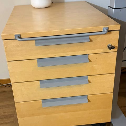 Toimistokaappi pyörillä, valmistettu vaaleasta puusta, sisältää neljä laatikkoa. Sopii paperien ja toimistotarvikkeiden säilytykseen. Pyörien ansiosta siirrettävissä helposti eri tiloihin.