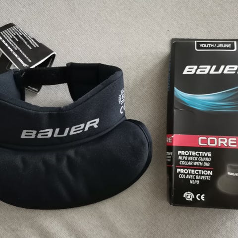 Hyväkuntoinen, ehjä ja hajuton lasten jääkiekkokaulasuoja. Merkki Bauer, koko 26-35cm, 10”-14”