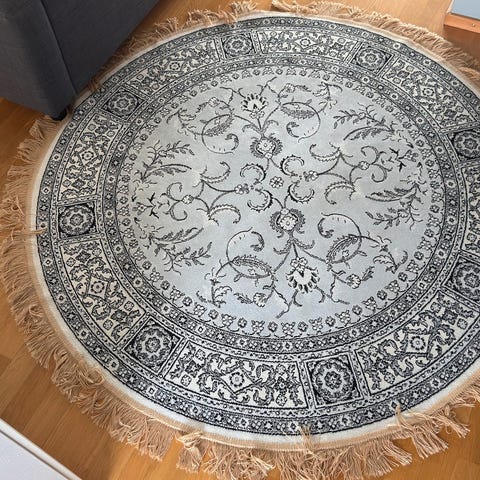 Pyöreä, valkoinen, käsintehty kotimainen matto. Halkaisija 77 cm.
