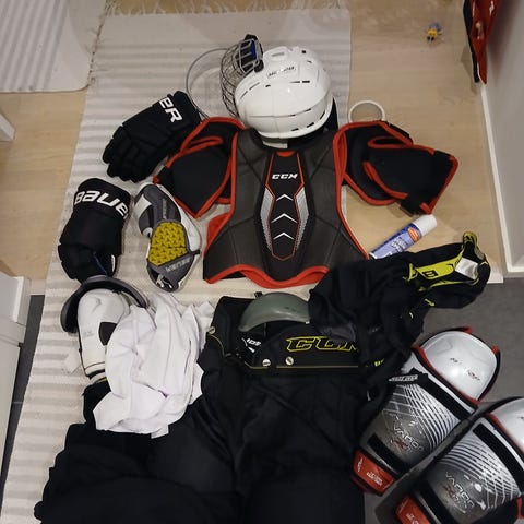 Sisältäen kaikki kuvassa näkyvät suojat sekä 4 treenipaitaa, varustekassin ja luistimet.