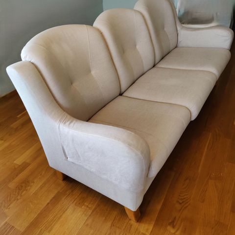 Teetetty sohva, joka on ollut vähäisessä käytössä ja suojattuna suurimman osan ajasta toisella kankaalla, joten pinta on säilynyt hyvänä ja kokonaisuus edelleen siisti