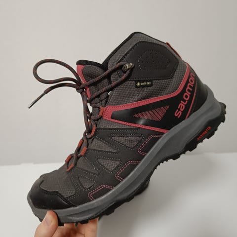 Märkiin keleihin hyvin sopivat Salomonin varrelliset Goretex-kengät. Koko 41 1/3, US 8, UK 7,5. Erittäin pitävä Contagrip-pohja. Kengät ehjät ulkoa ja sisältä. Sopivat hyvin syksyyn / alkutalveen. Kengissä ei ole karvallista vuorta.