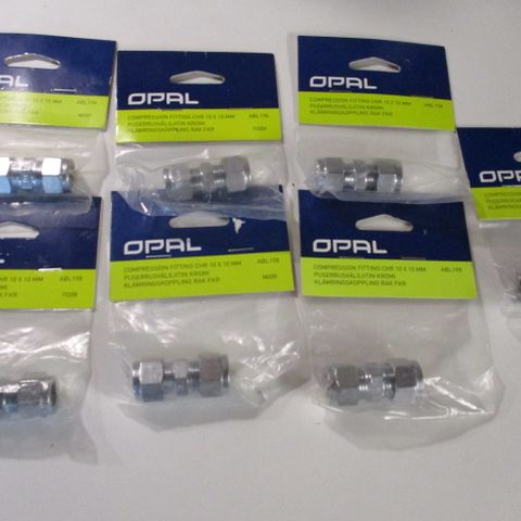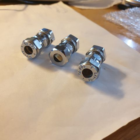 Laatikollinen puserrusliittimiä, helmiä, supistimia, t-haaroja yms. Kromattuja ja messinkisiä. Suurin osa uusia.