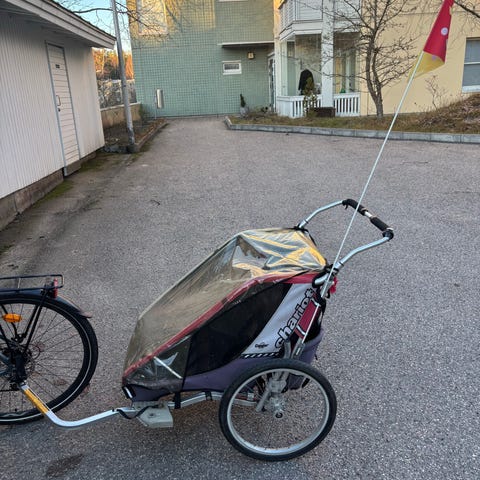 Isommilla renkailla varustettu huippu pyöräkärry kahdelle lapselle. Tällä voi ajella paljon mukavammin sorateillä ja huonommilla poluilla mitä vakiorenkailla.