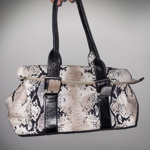 Nahkainen käsilaukku, jossa värikäs ja kuvioitu kuosi. Laukussa on vaaleat nahkaiset yksityiskohdat ja kantokahvat. Kantohihnan kiinnitys rikki. Kts kuva.