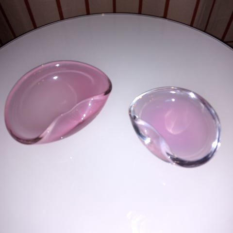 Myynnissä myös isompi Wirkkalan malja ja muita vaaleanpunaisia taidelaseja.