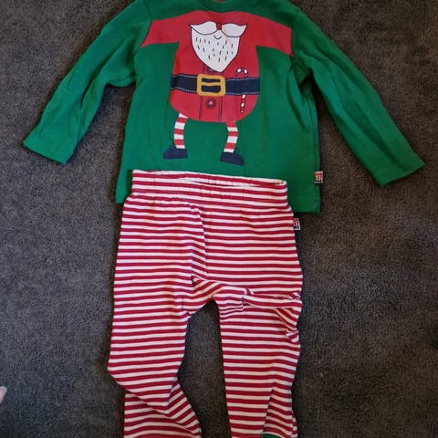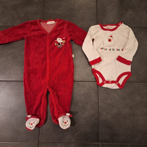 2 hauskaa jouluasua kokoa 68, suljetut jalkaterät pitää varpaat lämpiminä, molemmat saa neppareilla auki vaipanvaihtoa varten