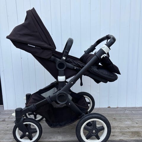 Bugaboo lastenrattaat All Black rungolla ja harmaalla kuomulla. Ei pahemmin haalistumaa vaikka valmistusvuosi 2017. Kuvassa näkyvät osat kuuluvat kauppaan. Nouto Kirkkonummi tai arkena Vallila. Koiratalous.